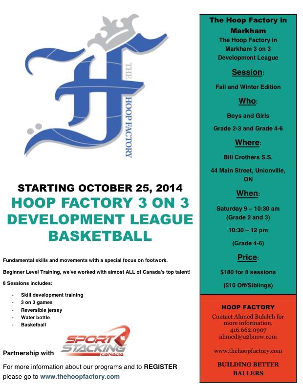 STARTING SAT OCT 25, 2014 HOOP FACTORY 3 ON 3 DEVELOPMENT LEAGUE BASKETBALL IN MARKHAM. Grade 2-6.